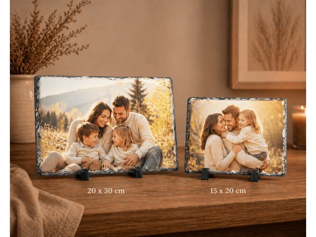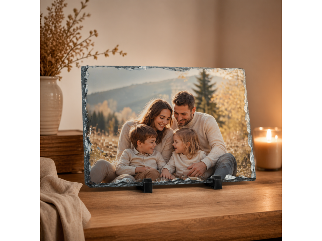 Zachyťte výnimočné momenty netradičným spôsobom – na prírodnej bridlici. Táto elegantná dekorácia spája modernú technológiu tlače s jedinečným vzhľadom prírodného kameňa, vďaka čomu každá fotka pôsobí autenticky a exkluzívne.
