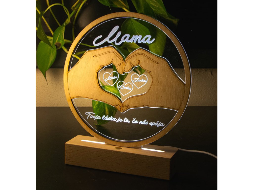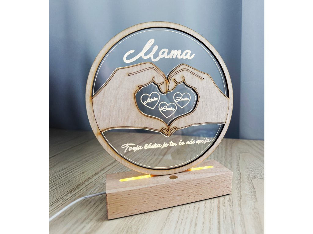 Darujte mame darček, ktorý povie viac než tisíc slov. Gravírovaná LED lampa „Mama“ v sebe spája eleganciu, emóciu a osobný dotyk. Vyrobená je z kvalitného bukového dreva a akrylu, ktorý je laserom vygravírovaný do tvaru rúk vytvárajúcich srdce. V jeho vnútri sú umiestnené mená detí a v spodnej časti je text podľa vášho želania – napríklad „Tvoja láska je to, čo nás spája“, alebo akýkoľvek vlastný odkaz pre mamu.