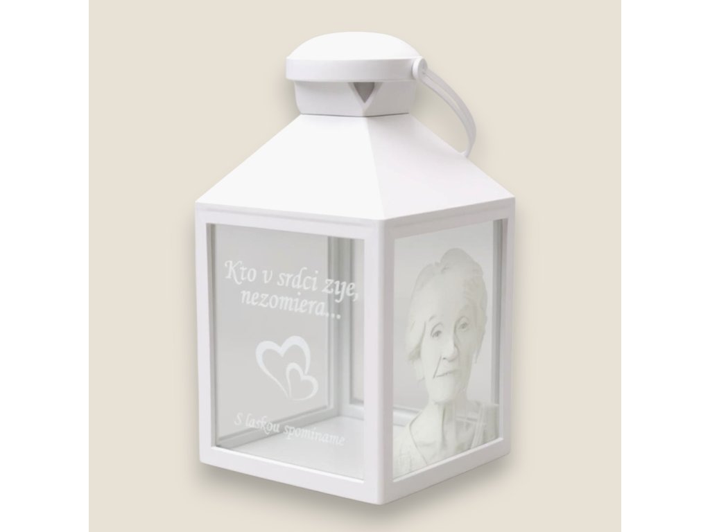Tento gravírovaný spomienkový lampáš je krásnym spôsobom, ako si uctiť pamiatku vašich blízkych. Vyrobený z kvalitného odolného plastu v elegantnej čiernej farbe s čírym sklom, vďaka ktorému nádherne vynikne personalizované gravírovanie. Môžete si naň nechať vygravírovať fotografiu, meno, dátum alebo krátky odkaz, čím sa stane jedinečným symbolom spomienok.