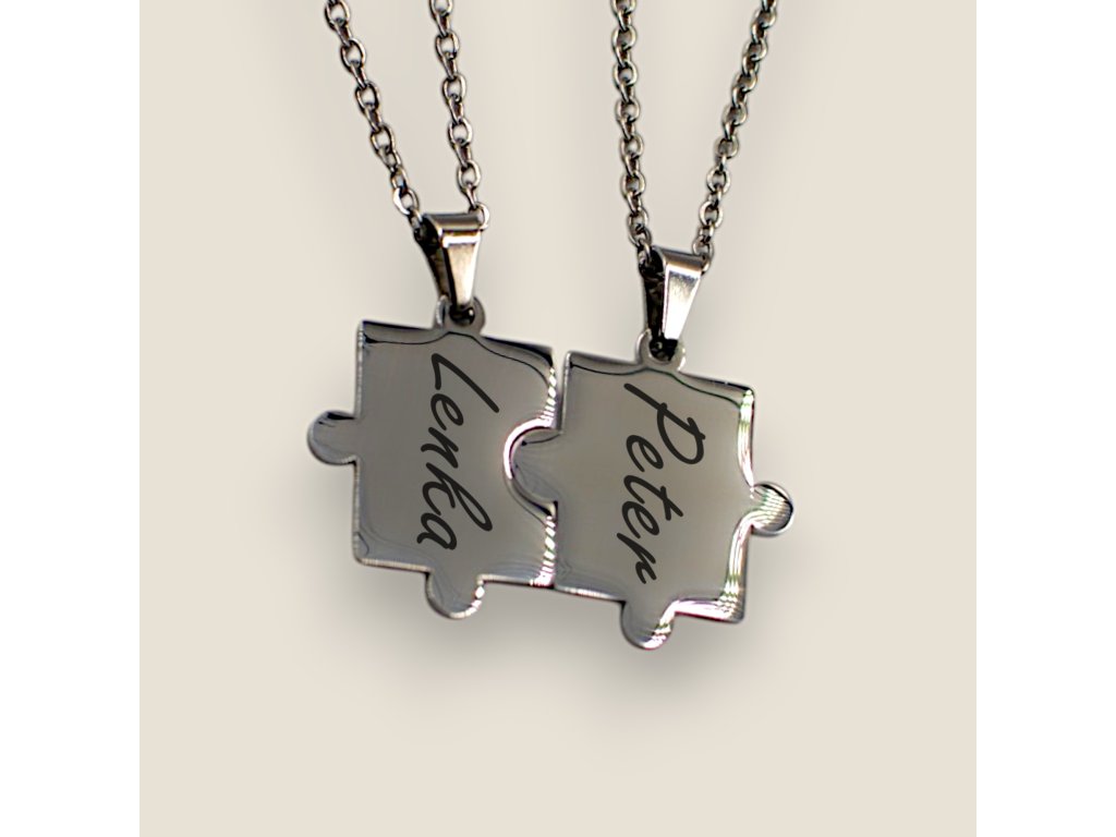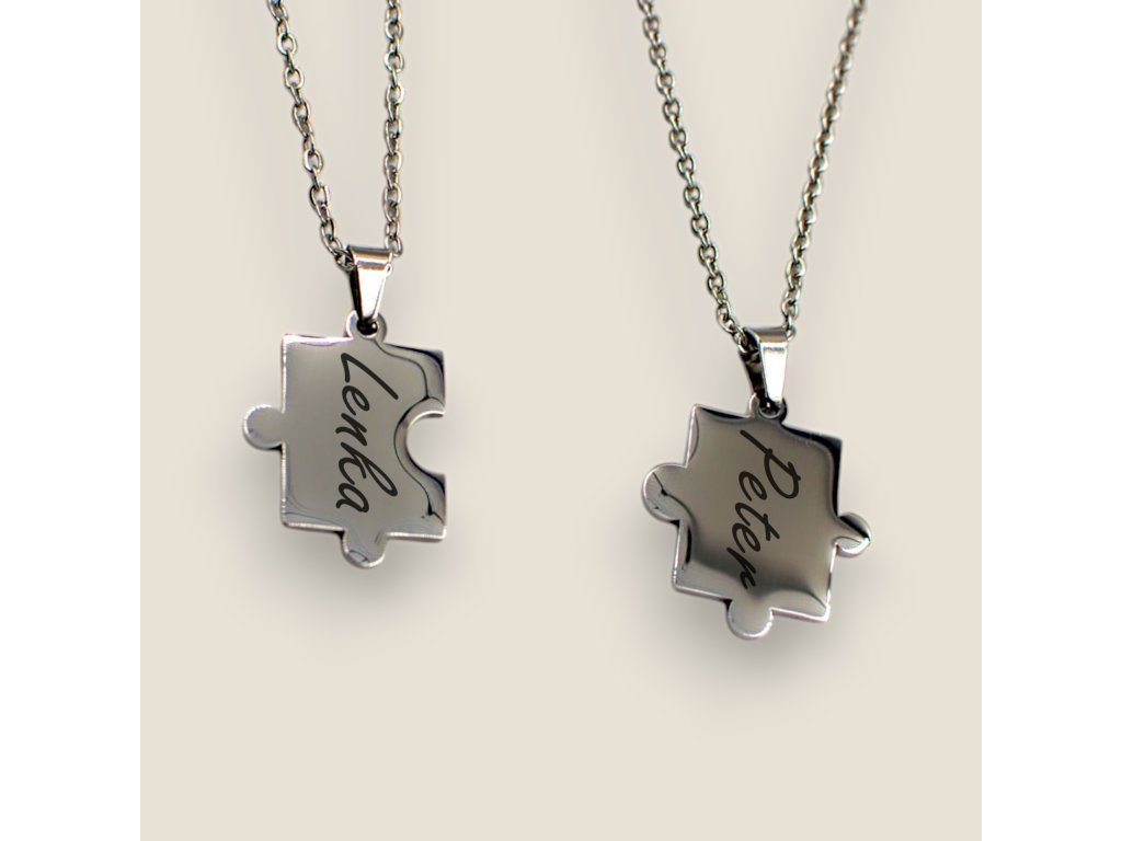 Fejezze ki szeretetét ezzel az egyedi szettel amely két tökéletesen egymásba illő puzzle darabból ál. Mindkét medál ezüst színű, minőségi sebészeti acélból készült. Hipoallergén, nem karcolódik, nem rozsdásodik.