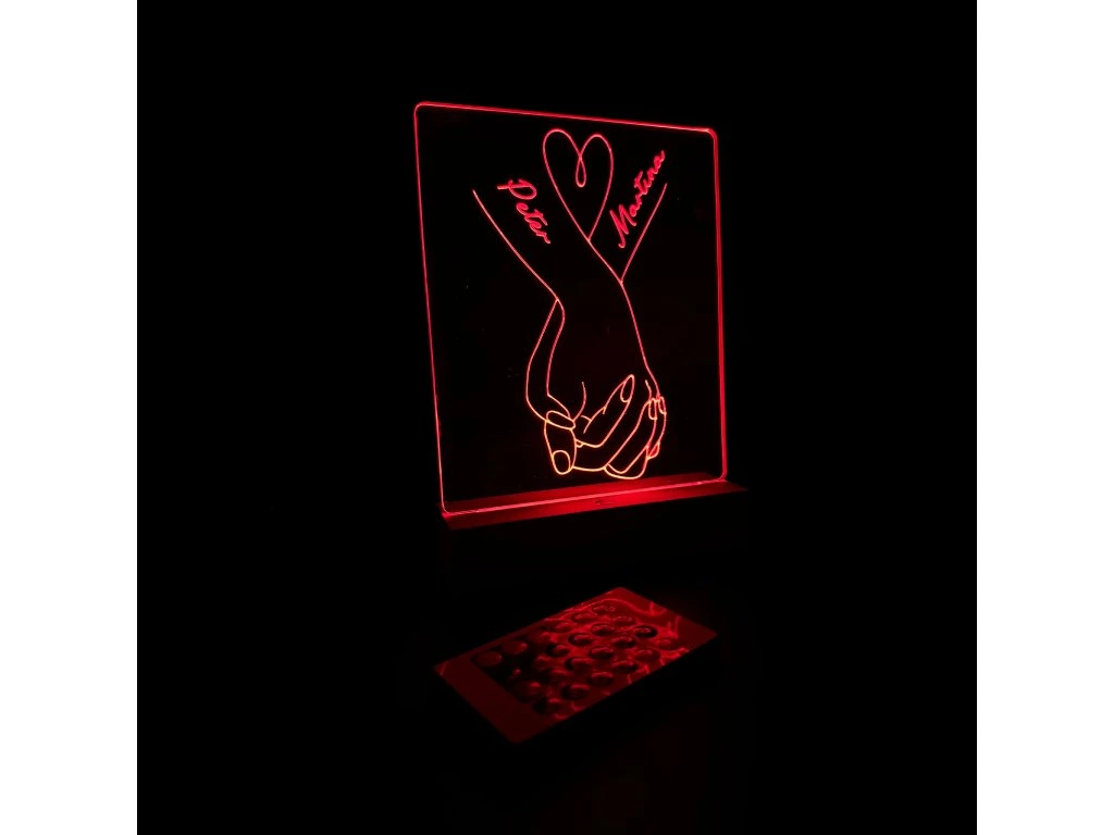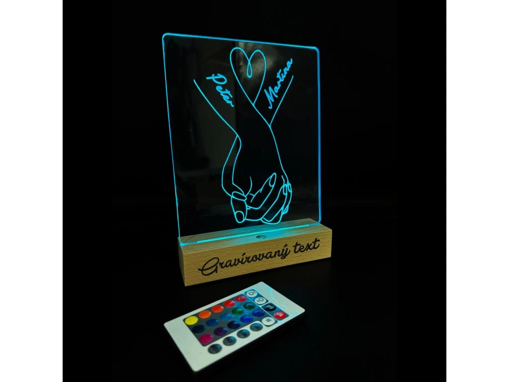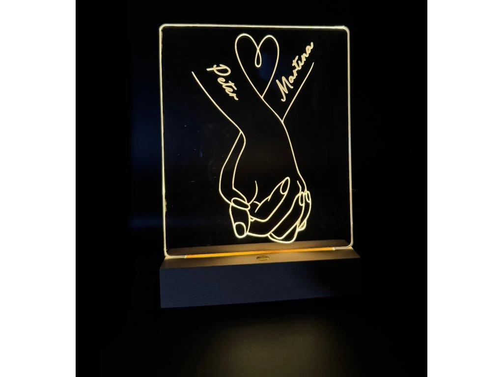 Ez a gravírozott LED lámpa tökéletes ajándék szerelmes párok számára. Az akril tábla finom és elegáns kézmotívumot ábrázol. Ezt egészíti ki a szerelmes párok neve. A fa talapzat további lehetőséget kínál a személyre szabásra – ide bármilyen személyes jelentőséggel bíró szöveg gravírozható.