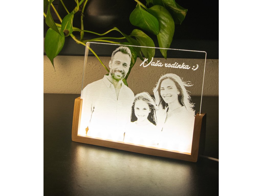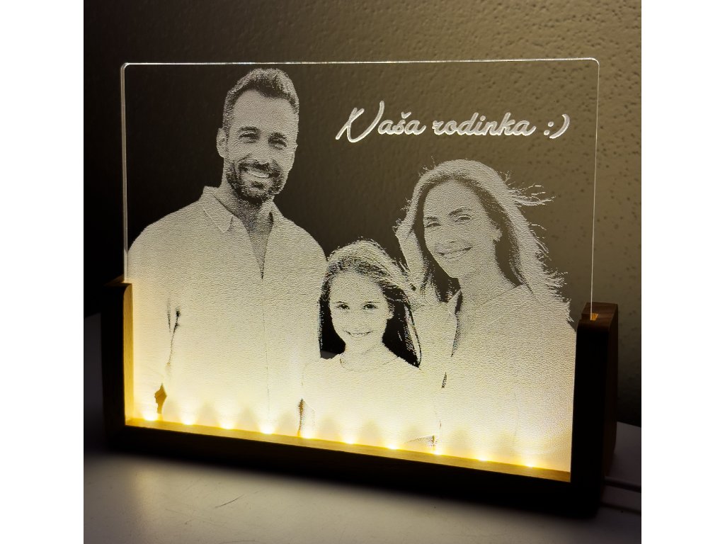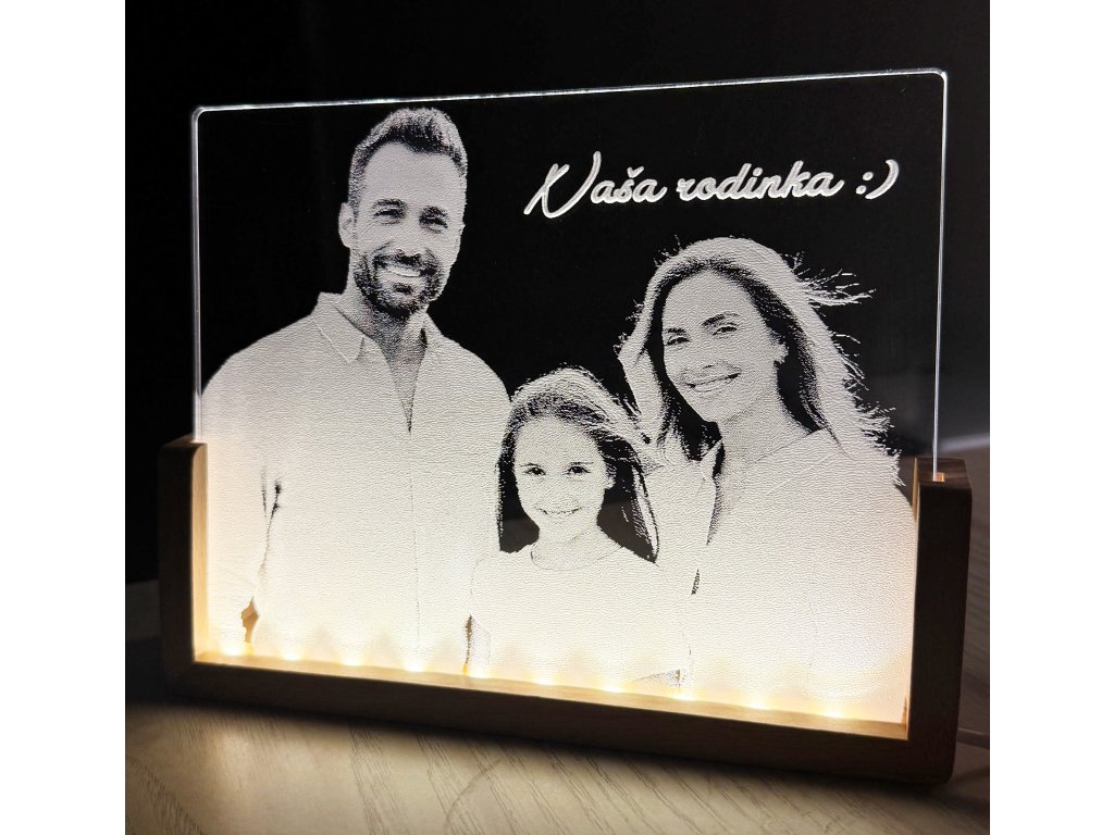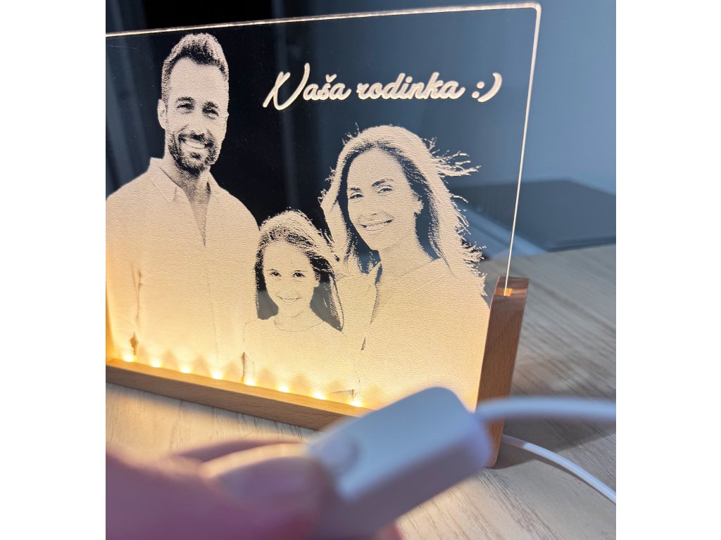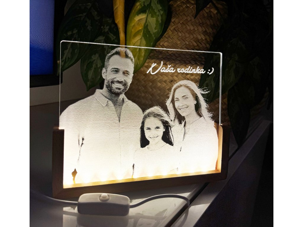 Elegantná LED lampa s gravírovanou fotografiou a textom – ideálny darček pre rodinu, partnera či priateľov.