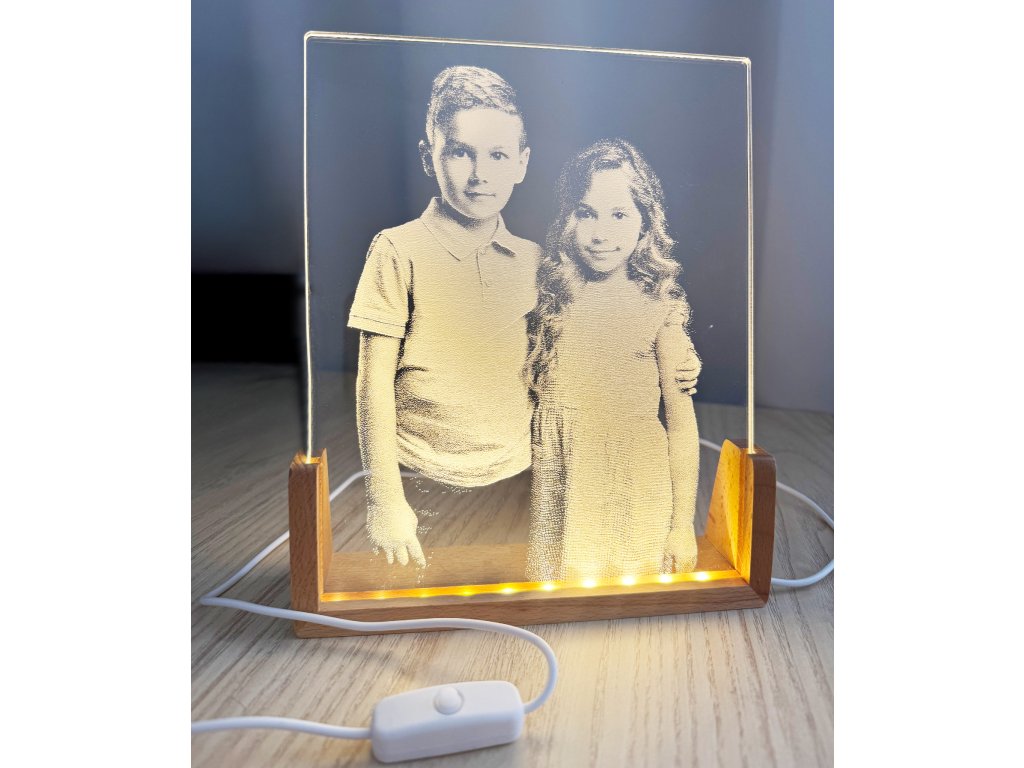 Elegantná LED lampa s gravírovanou fotografiou a textom – ideálny darček pre rodinu, partnera či priateľov.