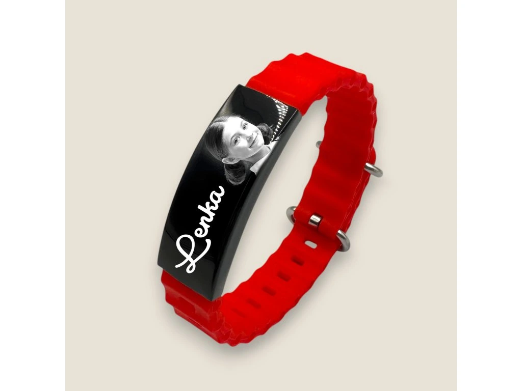 Štýlový silikónový náramok s kvalitnou chirurgickou oceľou a precíznym laserovým gravírovaním. Vytvorte si originálny doplnok s vlastnou fotkou alebo textom, ktorý má osobný význam. Pohodlné zapínanie ako na hodinkách zabezpečuje jednoduché nosenie aj spoľahlivé držanie na ruke. Dĺžka náramku je 23 cm.
