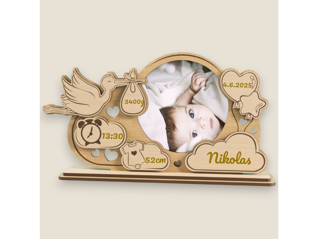 Fotorámik obsahuje priestor na vloženie vlastnej fotografie dieťaťa – vďaka tomu vznikne jedinečný a osobný doplnok (fotografia nie je súčasťou produktu). Pomocou precízneho laserového gravírovania do fotorámika zaznamenáme dôležité údaje o narodení dieťaťa: