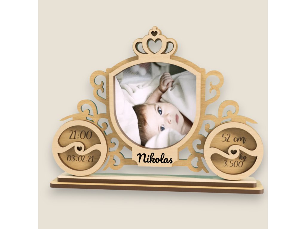 Fotorámik obsahuje priestor na vloženie vlastnej fotografie dieťaťa – vďaka tomu vznikne jedinečný a osobný doplnok (fotografia nie je súčasťou produktu). Pomocou precízneho laserového gravírovania do fotorámika zaznamenáme dôležité údaje o narodení dieťaťa: