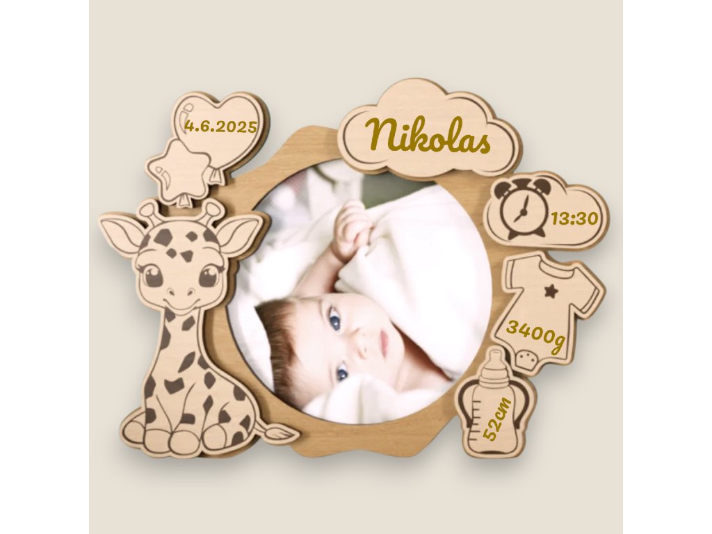 Pamätný detský fotorámik s údajmi o narodení - Žirafa