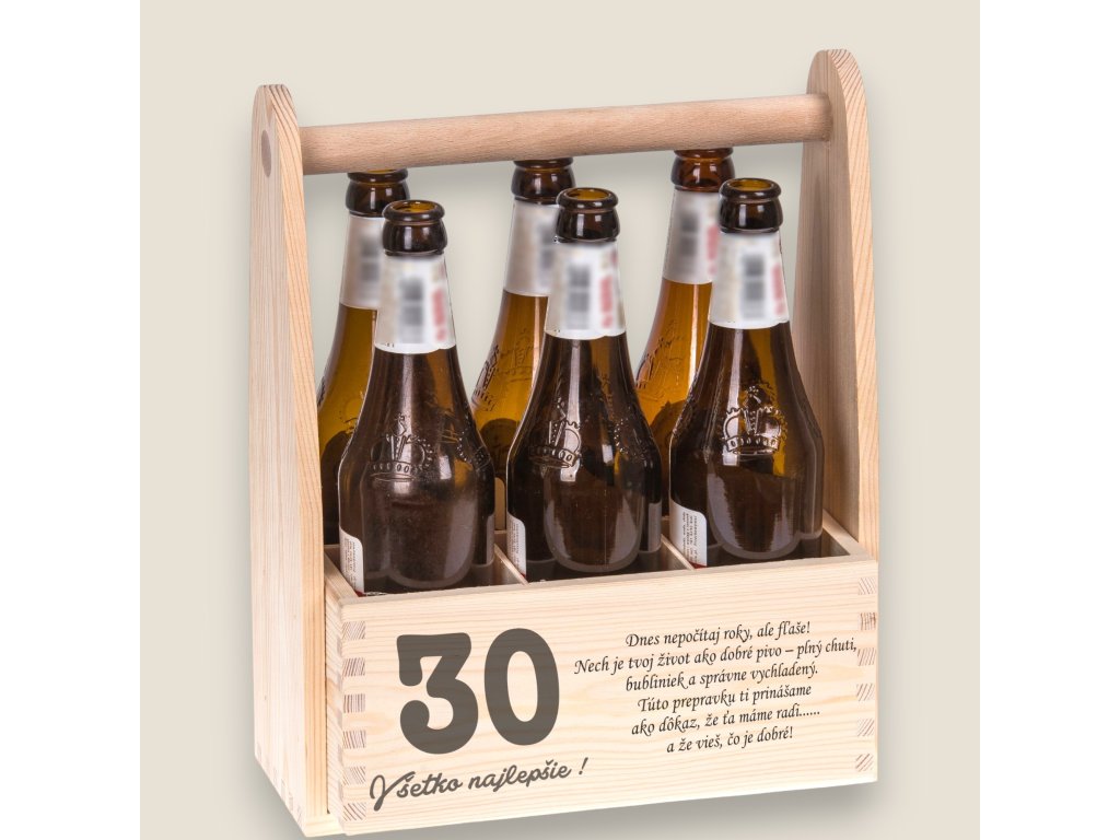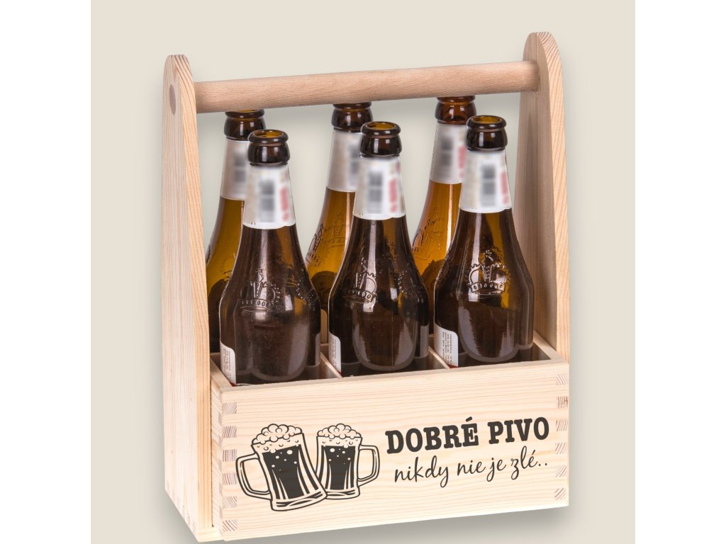 Prepravka pojme 6 klasických 0,5 l fliaš piva a je vybavená pevnou drevenou rúčkou pre pohodlné nosenie. Je vhodná nielen ako praktický doplnok na oslavu, ale aj ako vkusná dekorácia do pivnice či na chalupu.